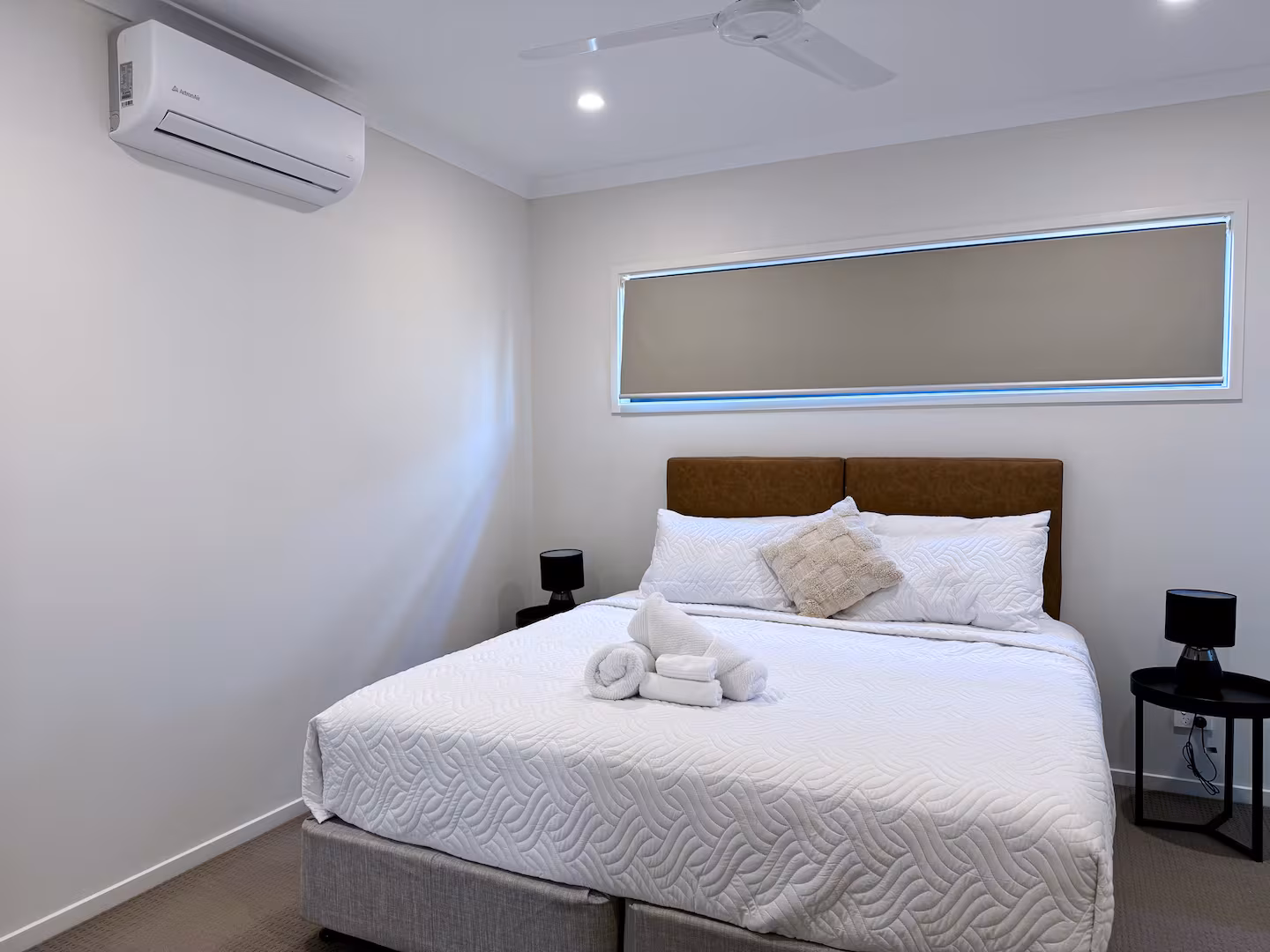 Natural light fills the rooms, complemented by soft neutral tones and minimalist décor that create a soothing, uncluttered atmosphere. Added conveniences such as ceiling fans, air conditioning, and bedside lamps allow guests to personalise their comfort throughout the day and night. Together, these thoughtful details reflect the warmth, attention to care, and welcoming hospitality that define the Respite House experience, making each bedroom a true place of rest and ease.