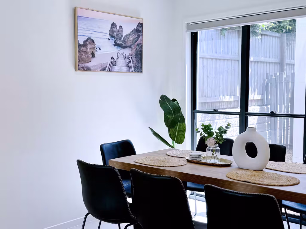 The dining area at Respite House is thoughtfully designed to be a bright, inviting space where guests can enjoy meals, share conversations, or spend quiet moments in comfort. Its open and airy feel creates a relaxed atmosphere that supports both social connection and peaceful dining during short-term stays.